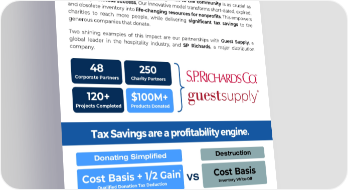 FEATURED CASE STUDIES We unlock the power of donations at scale. At Donating Simplified, we believe giving back to the community is as crucial as achieving business success. Our innovative model transforms short-dated, expired, and obsolete inventory into life-changing resources for nonprofits. This empowers charities to reach more people, while delivering significant tax savings to the generous companies that donate. Two shining examples of this impact are our partnerships with Guest Supply, a global leader in the hospitality industry, and SP Richards, a major distribution company. 48 250 Corporate Partners Charity Partners 120+ $100M+ Projects Completed Products Donated Tax Savings are a profitability engine. Donating Simplified Destruction * Cost Basis + 1/2 Gain Cost Basis VS Qualified Donation Tax Deduction Inventory Write-Off Deduct Up to 2x Cost Basis Maximum Tax Deduction | Donation is the Best Possible Treatment *Gain = the unrealized difference between Fair Market Value and the Cost Basis of the item. **This is not Tax Advice, please consult with your own tax advisory re: Code Section 170(e)(3). For intended recipients only. Donating Simplified | 02