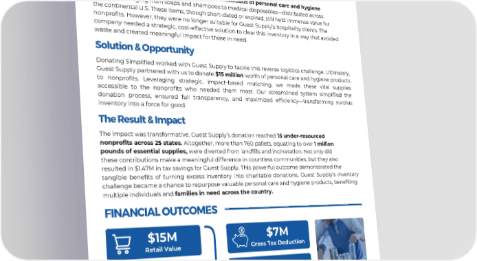 CASE 2: GUEST SUPPLY The Challenge Guest Supply faced a significant challenge: 30 truckloads of personal care and hygiene products—ranging from soaps and shampoos to medical disposables—distributed across the continental U.S. These items, though short-dated or expired, still held immense value for nonprofits. However, they were no longer suitable for Guest Supply’s hospitality clients. The company needed a strategic, cost-effective solution to clear this inventory in a way that avoided waste and created meaningful impact for those in need. Solution & Opportunity Donating Simplified worked with Guest Supply to tackle this reverse logistics challenge. Ultimately, Guest Supply partnered with us to donate $15 million worth of personal care and hygiene products to nonprofits. Leveraging strategic, impact-based matching, we made these vital supplies accessible to the nonprofits who needed them most. Our streamlined system simplified the donation process, ensured full transparency, and maximized efficiency—transforming surplus inventory into a force for good. The Result & Impact The impact was transformative. Guest Supply’s donation reached 15 under-resourced nonprofits across 25 states. Altogether, more than 760 pallets, equating to over 1 million pounds of essential supplies, were diverted from landfills and incineration. Not only did these contributions make a meaningful difference in countless communities, but they also resulted in $1.47M in tax savings for Guest Supply. This powerful outcome demonstrated the tangible benefits of turning excess inventory into charitable donations. Guest Supply’s inventory challenge became a chance to repurpose valuable personal care and hygiene products, benefiting multiple individuals and families in need across the country. FINANCIAL OUTCOMES $7M $15M Retail Value Gross Tax Deduction $9M $1.47M Fair Market Value Tax Savings $5M 4.3x Total Cost Basis ROI for Service For intended recipients only. Donating Simplified | 04