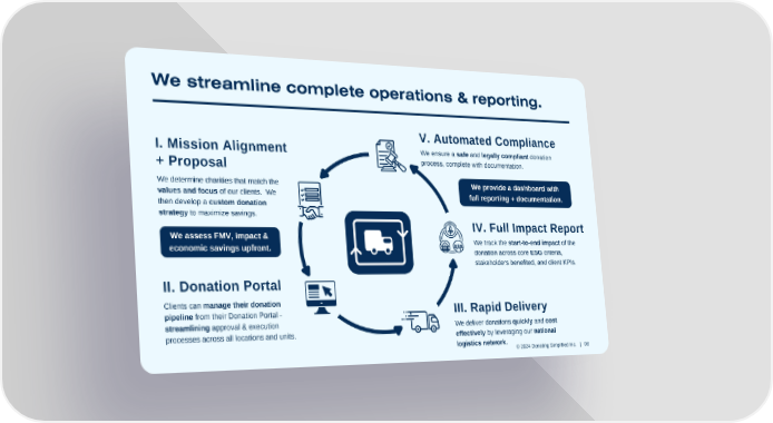 We streamline complete operations & reporting. V. Automated Compliance We ensure a safe and legally compliant donation I. Mission Alignment process, complete with documentation. + Proposal We determine charities that match the We provide a dashboard with values and focus of our clients. We full reporting + documentation. then develop a custom donation strategy to maximize savings. IV. Full Impact Report We assess FMV, impact & We track the start-to-end impact of the economic savings upfront. donation across core ESG criteria, stakeholders benefited, and client KPIs. II. Donation Portal Clients can manage their donation III. Rapid Delivery pipeline from their Donation Portal - streamlining approval & execution We deliver donations quickly and cost processes across all locations and units. effectively by leveraging our national logistics network. © 2024 Donating Simplified Inc. | 08