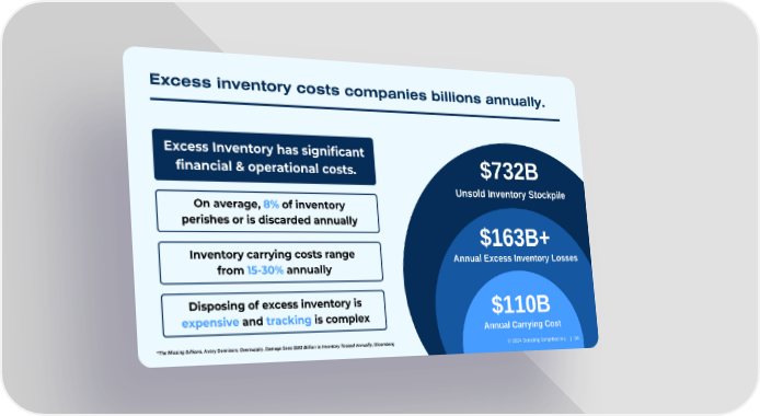 Excess inventory costs companies billions annually. Excess Inventory has significant financial & operational costs. $732B Unsold Inventory Stockpile On average, 8% of inventory perishes or is discarded annually $163B+ Inventory carrying costs range Annual Excess Inventory Losses from 15-30% annually Disposing of excess inventory is $110B expensive and tracking is complex Annual Carrying Cost *The Missing Billions, Avery Dennison; Oversupply, Damage Sees $163 Billion in Inventory Tossed Annually, Bloomberg © 2024 Donating Simplified Inc. | 04