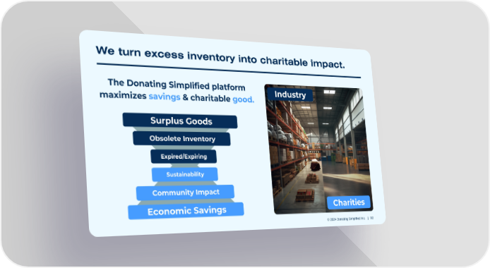 We turn excess inventory into charitable impact. The Donating Simplified platform Industry maximizes savings & charitable good. Surplus Goods Obsolete Inventory Expired/Expiring Sustainability Community Impact Charities Economic Savings © 2024 Donating Simplified Inc. | 03