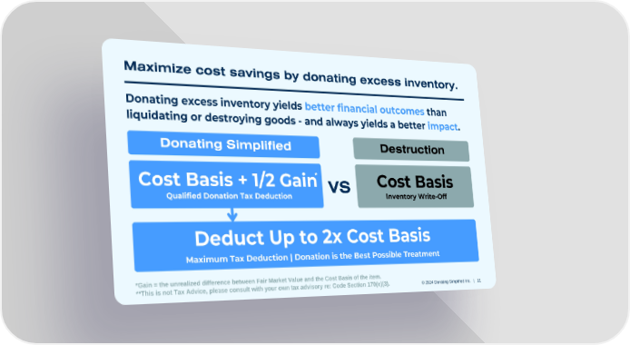 Maximize cost savings by donating excess inventory. Donating excess inventory yields better financial outcomes than liquidating or destroying goods - and always yields a better impact. Donating Simplified Destruction * Cost Basis + 1/2 Gain Cost Basis VS Qualified Donation Tax Deduction Inventory Write-Off Deduct Up to 2x Cost Basis Maximum Tax Deduction | Donation is the Best Possible Treatment *Gain = the unrealized difference between Fair Market Value and the Cost Basis of the item. © 2024 Donating Simplified Inc. | 11 **This is not Tax Advice, please consult with your own tax advisory re: Code Section 170(e)(3).